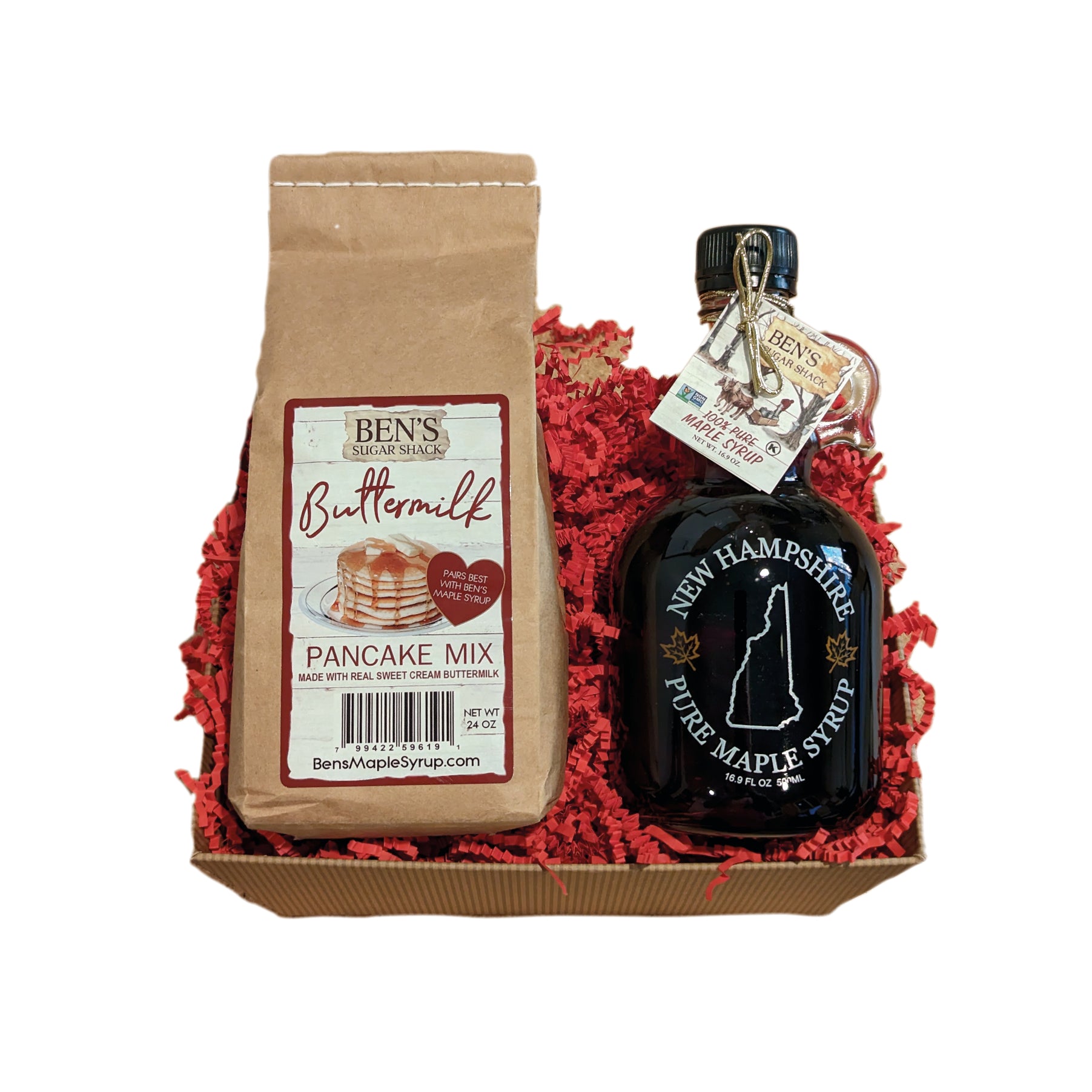 Our most popular 16.9 oz New Hampshire Bottle and buttermilk pancake mix combo is the perfect gift this holiday season! Both items are nestled into red crinkle cut paper and includes a personalized note and poly plastic wrap wrapped tightly around.