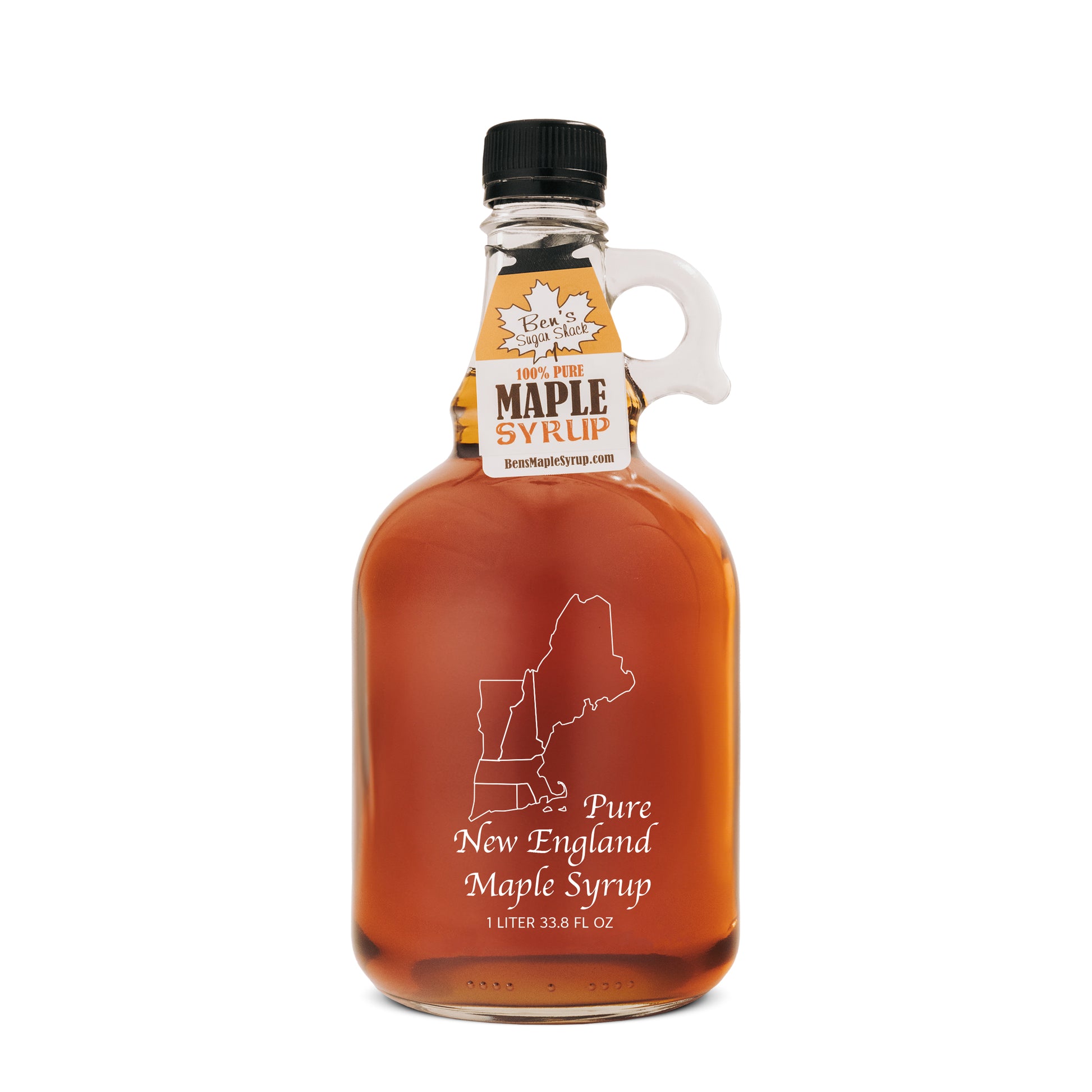 100% pure maple syrup in a fancy glass printed jug bottle with a New England states Design (33.8 oz). All of our Maple syrup is bottled in a Nut Free Facility in Temple New Hampshire. There are no preservatives or additives to Ben's Pure Maple Syrup. Maple syrup has many uses and many don't realize the health benefits that comes with consuming this pure liquid gold from nature.